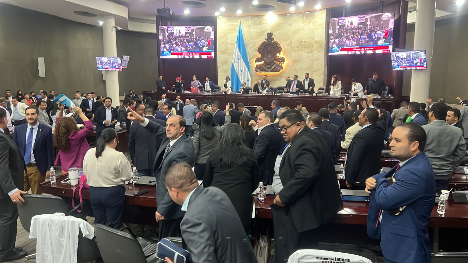 Los diputados y miembros de los colectivos del partido Libre se aprestaron en las gradas del hemiciclo legislativo y gritaron las consignas a unísono: «El pueblo unido jamás será vencida», «Queremos Corte» y «El que no salte es cachureco».