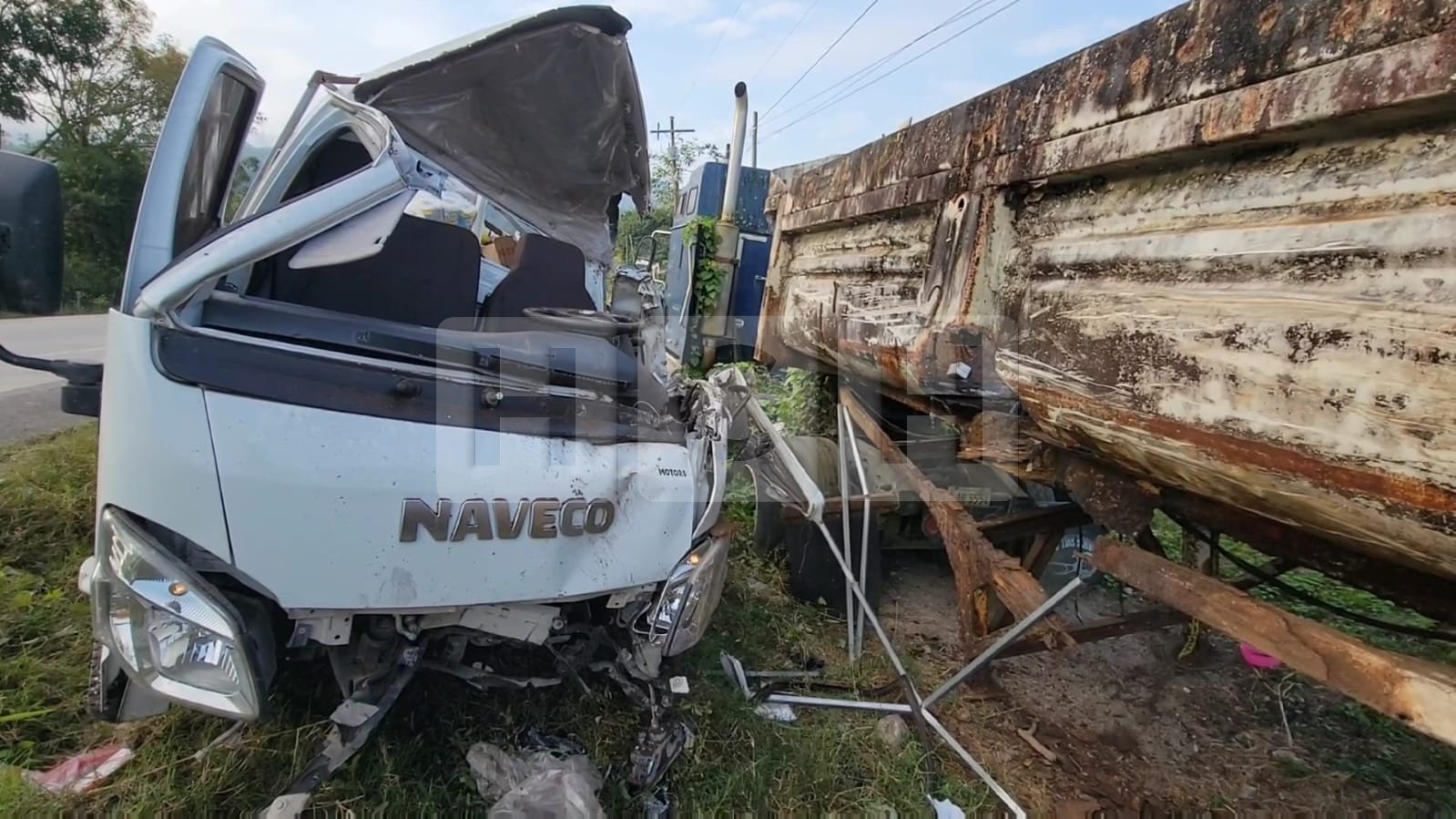 Completamente destrozado terminó un camión de paila larga que cargaba mercadería, tras precipitarse abruptamente fuera de la carretera e impactar aparatosamente contra la solida estructura de una rastra, la misma se encuentra aparcada desde hace mucho tiempo en la calle en estado de abandono.