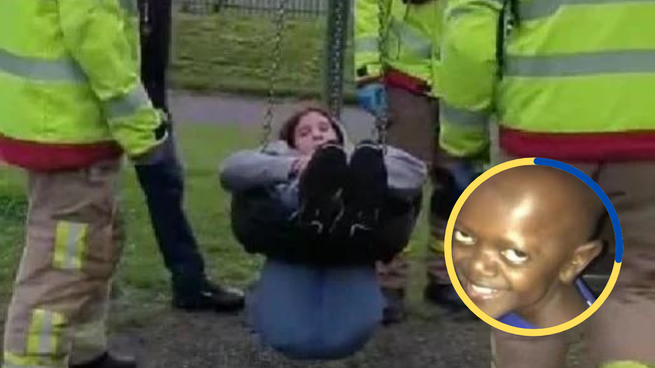 A través de cinco planos, el primero de los cuales está bajo las palabras «Solo mi hija Kayla quedará atrapada en el columpio», Mary muestra a una niña atrapada en un trapecio con un neumático como asiento, mientras tres bomberos intentan encontrar la manera de ayudar. ella afuera.