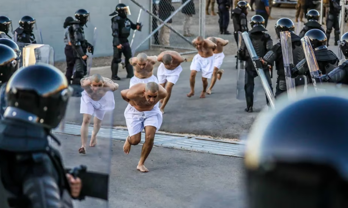 En las imágenes se puede apreciar a un grupo de pandilleros con el torso desnudo, vistiendo apenas pantaloncillos blancos y sin ningún tipo de calzado, custodiados por policías mientras se alinean en un gran patio de otra de las prisiones en el país.