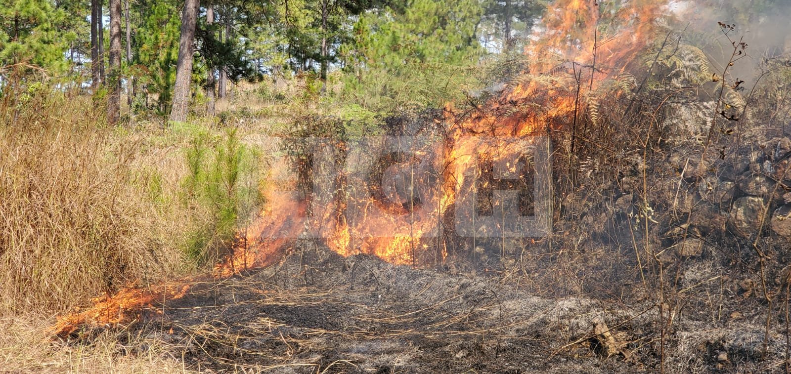 Fueron decenas de pinos consumidos por las voraces llamas que se propagan de manera inmediata, el Cuerpo de Bomberos está en el lugar de los hechos y trabaja arduamente para apagar el fuego.