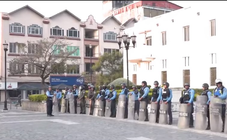 Agentes de la Alcaldía Municipal de San Pedro Sula resguardan el Palacio Municipal sampedrano ante el anuncio de protestas por parte del sindicato de esta municipalidad.