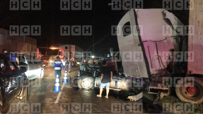 En la carretera CA-13 exactamente a altura de la aldea Los Leones, sector de Puente Alto, se registró un fuerte accidente automovilístico entre dos rastras que colisionaron.