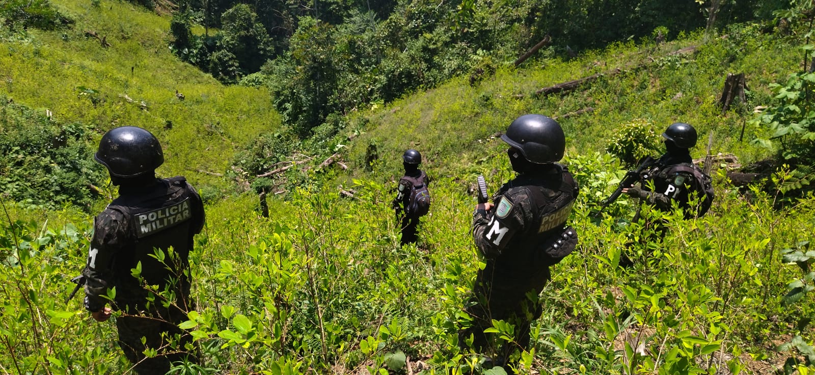 Entre el Parque Nacional Pico Bonito y el refugio de vida silvestre Texiguat, en La Masica, Atlántida, las Fuerzas Armadas a través de Policía Militar del Orden Público localizó y aseguró una plantación de hoja de coca con una extensión de 45 manzanas contabilizando 337,590 plantas y se aseguró además un narcolaboratorio.