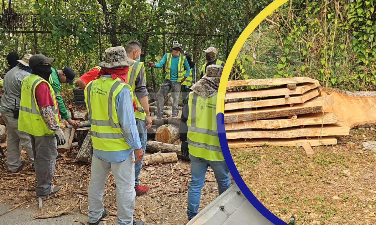 Agentes de la Gerencia de Ambiente de la Alcaldía Municipal de San Pedro Sula decomisan cientos de troncos y piezas de madera en el sector de Panorama de la ciudad industrial del país.