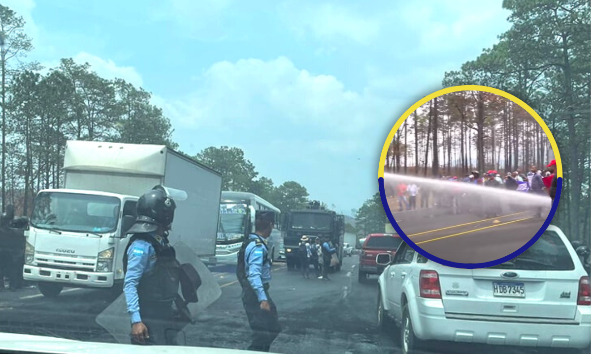 ¡Sodoma y Gomorra! Los agentes de la Policía Nacional lanzan brutalmente agua y se van a los golpes contra sus excompañeros que fueron depurados de esta institución y que hoy protestaban en la carretera internacional CA-5 a la altura de Zambrano, Distrito Central.