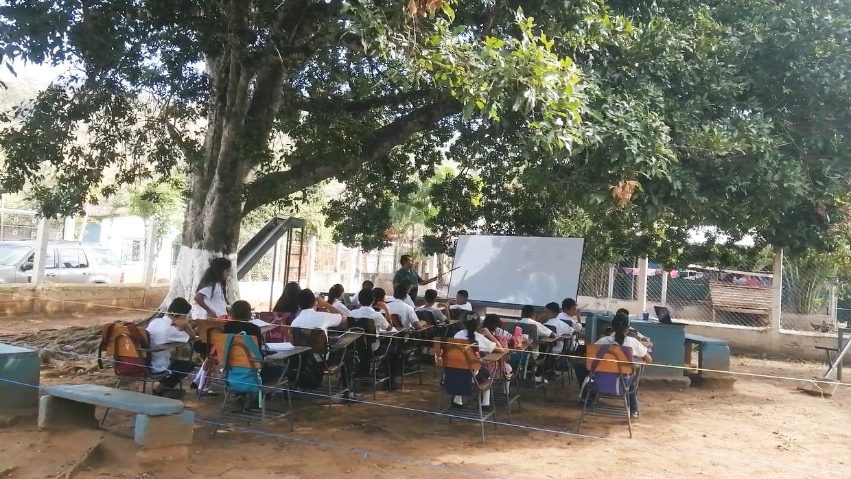 Debajo de un árbol, al aire libre, un piso de tierra, una pizarra improvisada, y un cerco perimetral de cabuya, así reciben clases los infantes de la escuela «Soledad Rivera» de aldea Santa Rosita en el municipio de Gualala, Santa Bárbara.