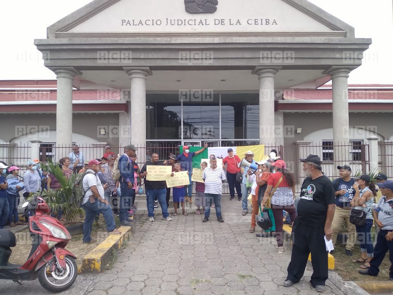 Grupos campesinos protestan frente a los juzgados de la ciudad de La Ceiba, Atlántida y exigen la liberación de la pastora Nolvia Obando, quien fue detenida cuando agentes de la Policía Nacional realizaban desalojos.