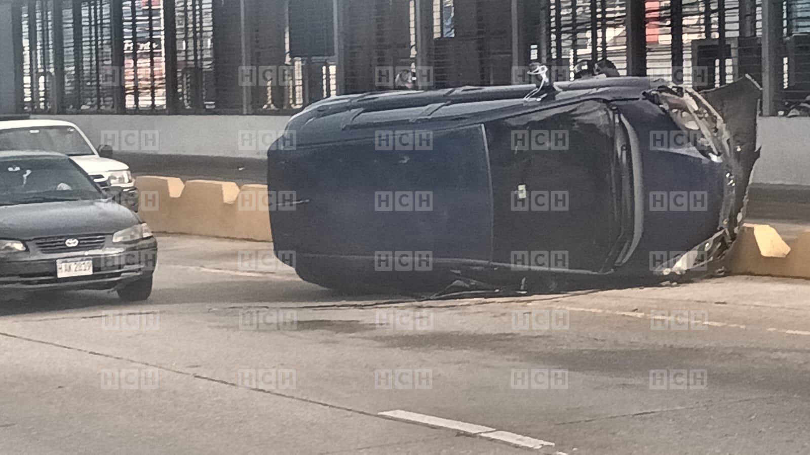 Un fuerte accidente tipo volcamiento dejó grandes pérdidas materiales en el bulevar Suyapa de Tegucigalpa, justamente en una de las casetas del Trans-450.