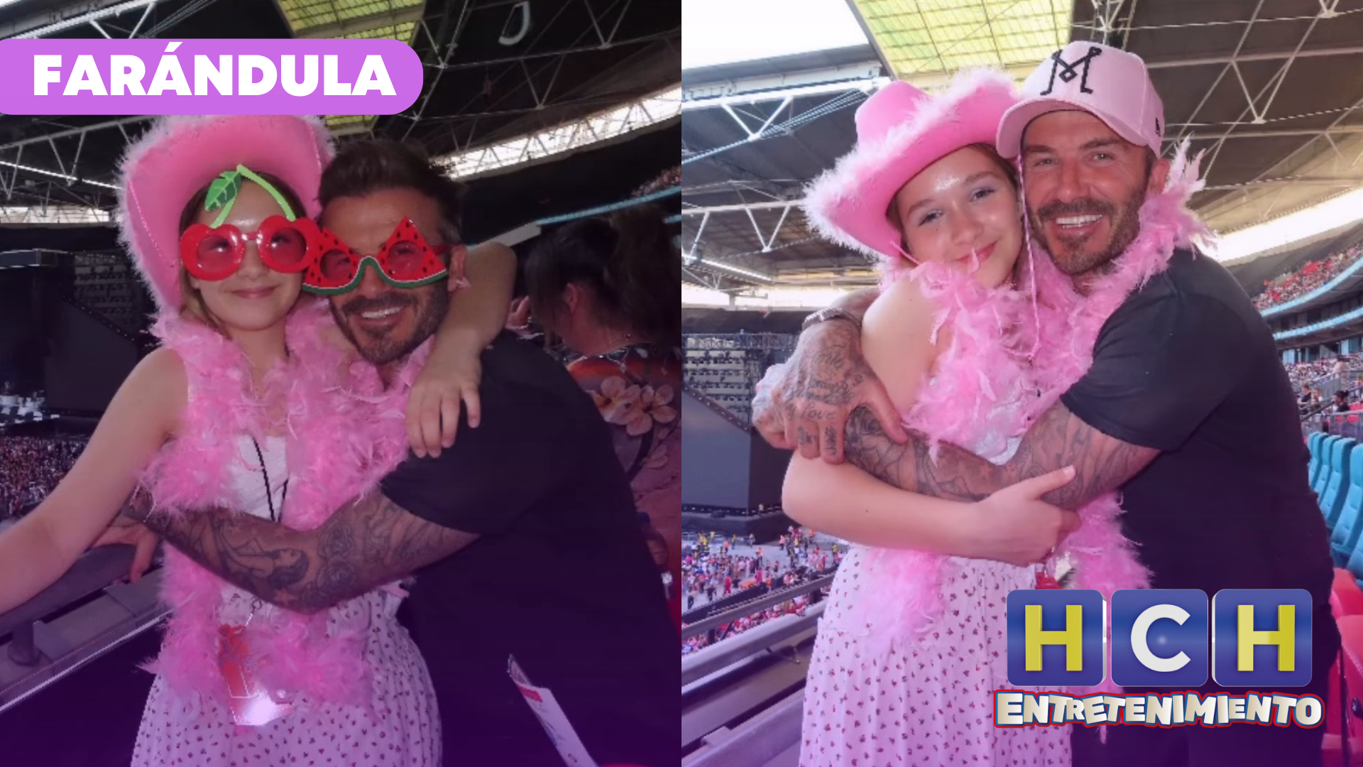 Harper se ve adorable ya que luce una playera blanca, y una bufanda de plumas rosas con una texana en color rosa, un atuendo muy típico de las fanáticas de Harry Styles. En tanto, David Beckham lució una playera negra y también una bufanda rosa de plumas. Ambos lucen felices de este emotivo momento de padre e hija.
