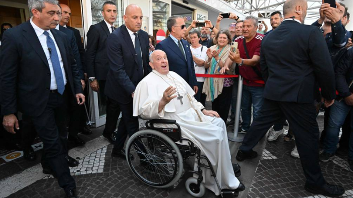El papa, que sonrió a todos ellos, estuvo acompañado hasta el coche por el cirujano que le operó de la hernia abdominal y también en julio de 2021 en el colon, Sergio Alfieri.