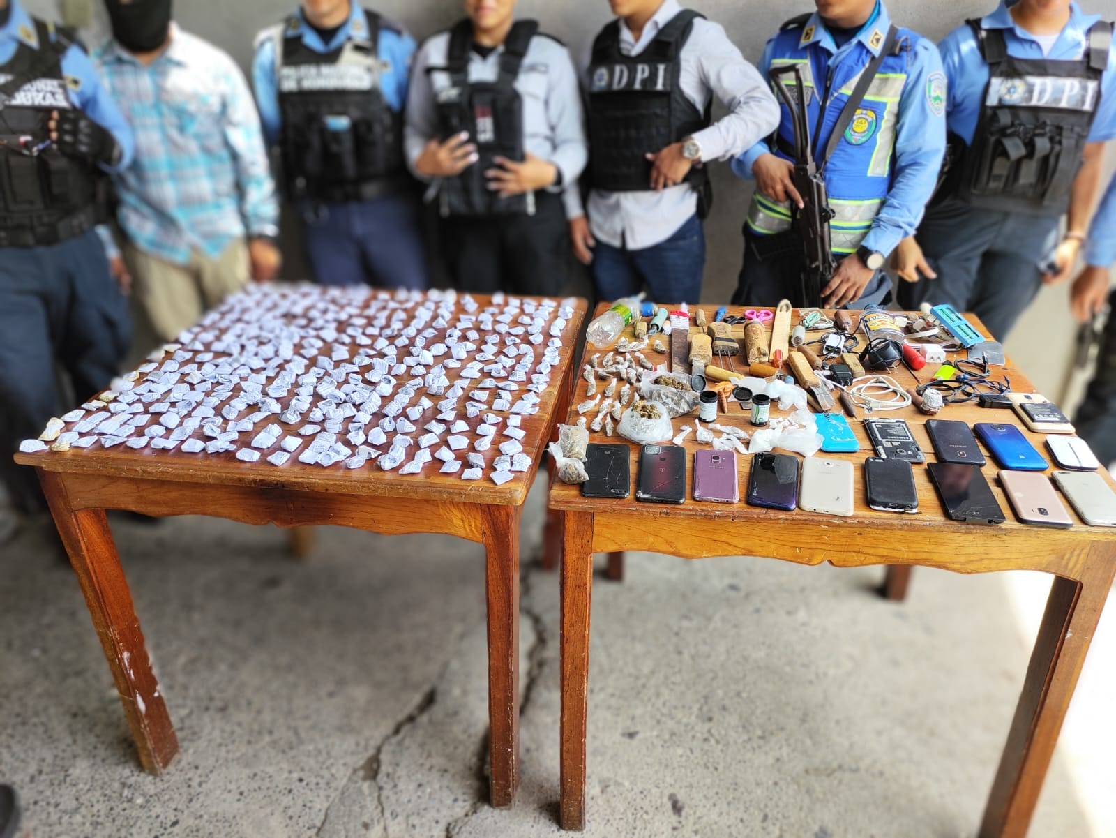 Atlántida. Martes 20 de junio de 2023.- Para precautelar la seguridad en el centro penitenciario ubicado en el barrio Ingles de La Ceiba, la Policía Nacional efectuó una requisa que dejó un resultado positivo. Se decomisó teléfonos celulares, objetos cortopunzantes y un fuerte envoltorio de droga.
