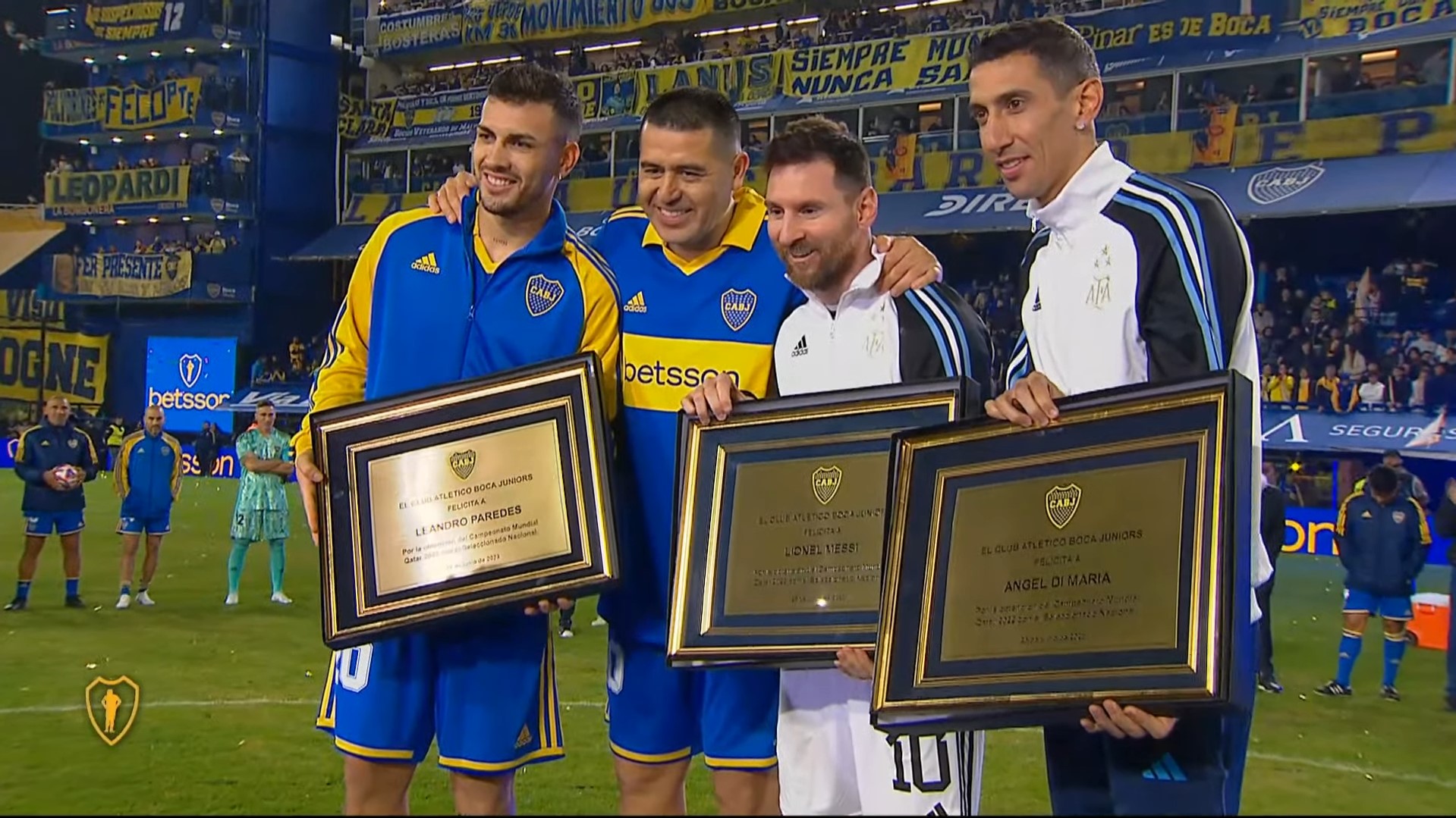 Ángel Di María, Leando Paredes y el técnico Lionel Scaloni, también participaron en el encuentro, y fueron conmemorados con una placa especial antes del partido por haber ganado el Mundial.