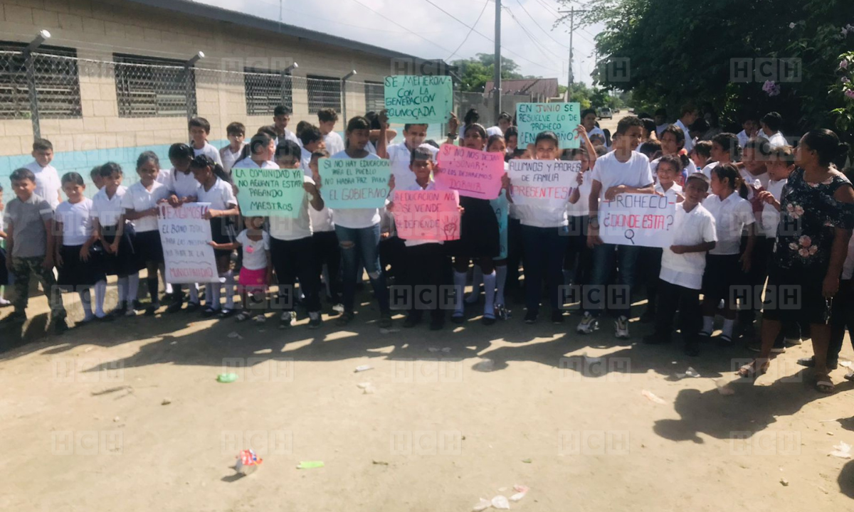 Padres de familia y alumnos de la escuela “Leopoldo Crivelli” de la colonia Juan Orlando Hernández, municipio de Choloma, Cortés, protestan para que a los maestros de este centro educativo se les pague su salario.