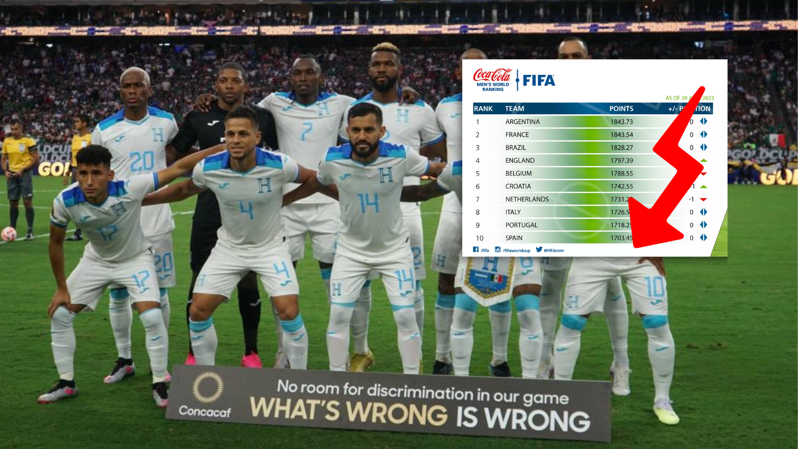 La Selección de Honduras recibe una mala noticia, previo a enfrentar su segunda llave de Fase de Grupos de la Copa Oro ante el combinado de Qatar. Los malos resultados de los dirigidos por Diego Vásquez, les ha pasado factura y ahora siguen en la posición 81 del ranking con 1.296,42 puntos. Esta posición sigue siendo la misma a la que escalaron en el pasado registro de la FIFA en abril del 2023.