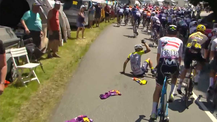 La bandera de un aficionado, que se encontraba pegada a la parte izquierda de la calzada, llegó un momento en el que se rompió, con tan mala suerte de enredarse en la bicicleta del corredor, provocando una caída aparatosa, en la que solo se vio implicado el ciclista francés.