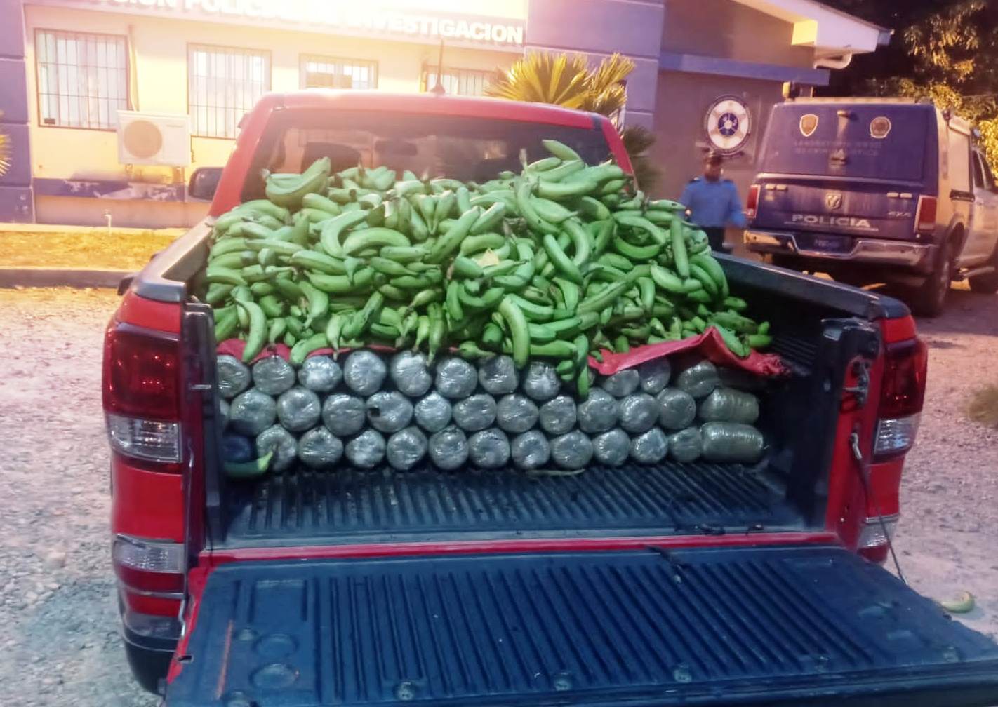 Los arrestados se trasladaban en un vehículo tipo pickup color rojo, y allí llevaban 350 libras de supuesta droga tipo marihuana escondidas bajo racimos de plátanos.