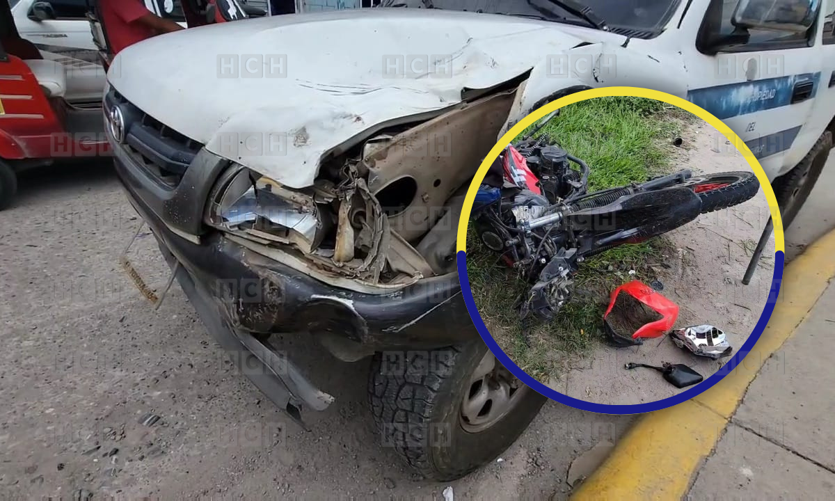 Con fractura en fémur de pierna derecha, profundas heridas tipo desgarre en glúteos y otras lesiones en diferentes partes del cuerpo ha resultado un joven 22 años, esto tras haber sido fuertemente embestido por un vehículo tipo pickup, propiedad del Estado de honduras, cuándo se conducía a bordo de una motocicleta.