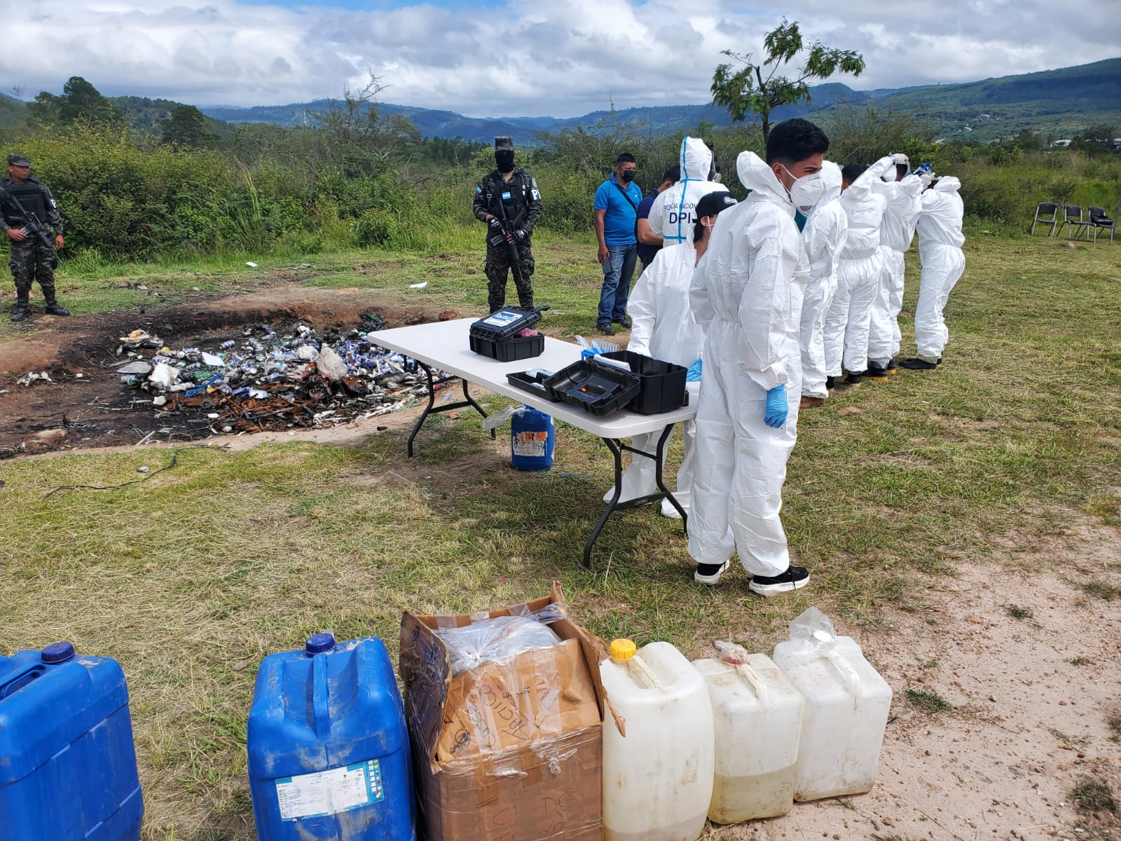incineración de un lote de sustancias químicas decomisadas en una infraestructura artesanal de procesamiento de drogas descubierta en febrero pasado en la aldea Nueva Esperanza, Limón, Colón.
