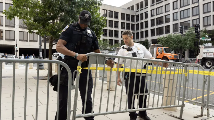 Se ha instalado un perímetro de seguridad alrededor del juzgado E Barrett Prettyman, sede del tribunal federal del Distrito de Columbia, que lleva el caso del exmandatario. Desde el edificio puede verse el Capitolio, que se encuentra a unos 500 metros.