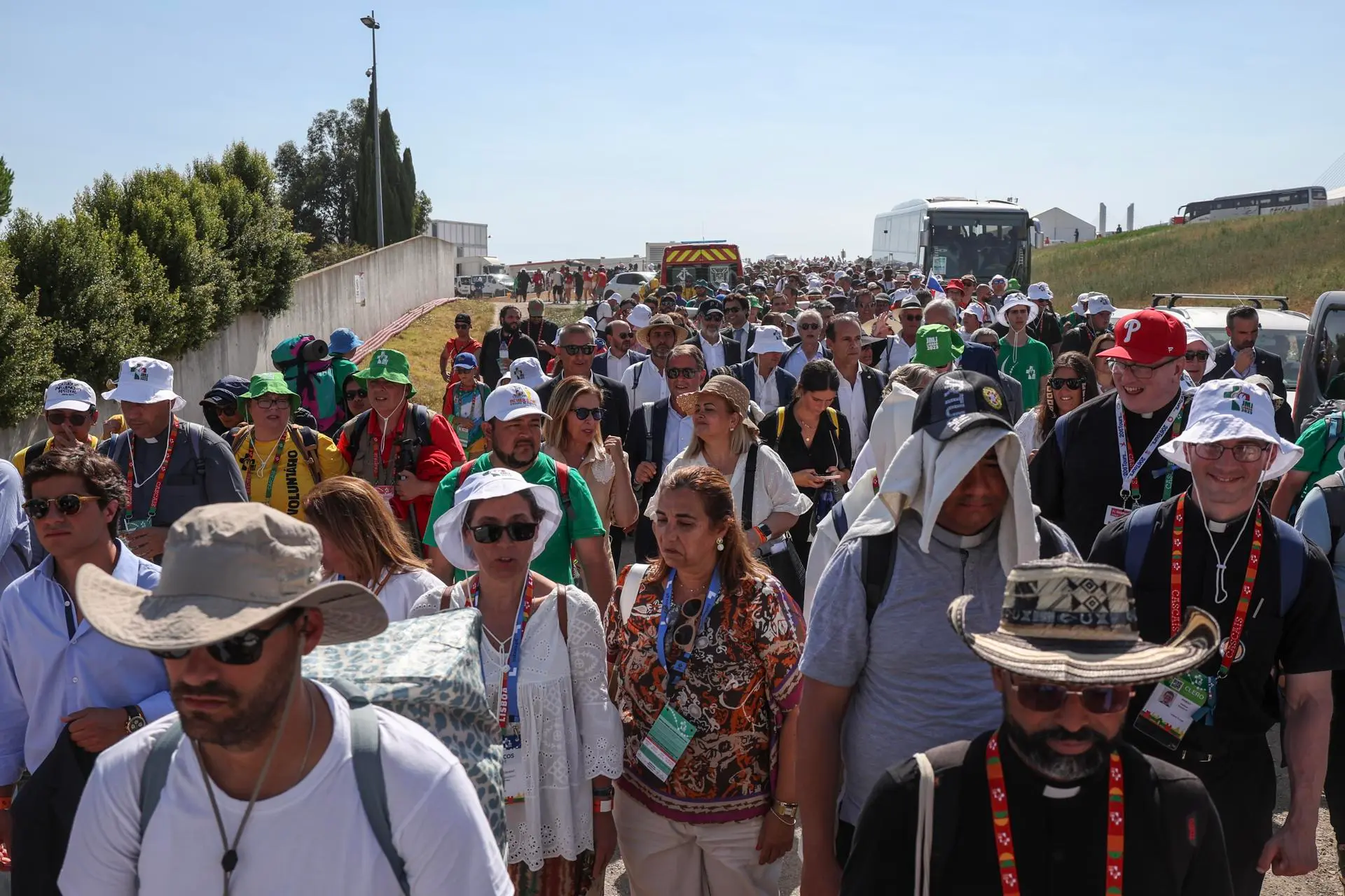 Antes de llegar, miles de personas saludaron el paso de la comitiva papal desde la sede de la Nunciatura en Lisboa hasta el paseo marítimo de Alges, a lo largo de 12 kilómetros, protegidos del sol con gorros, paraguas y pañuelos.