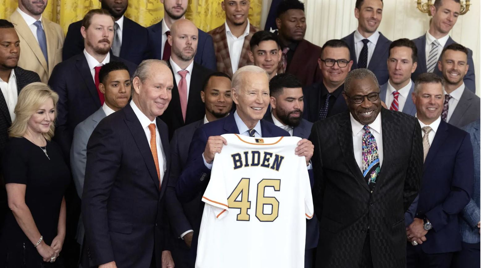 El equipo entregó a Biden, el presidente número 46, una camiseta de honor con el número 46. El trofeo de la MLB estuvo en exhibición durante la ceremonia en el East Room, donde el equipo también posó para las fotos.