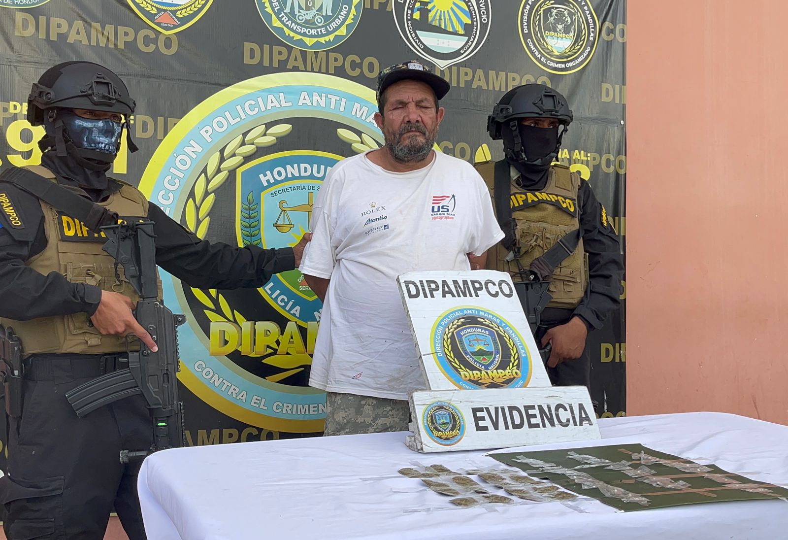El capturado a sido identificado por las autoridades como Santos Aldo Matamoros Caceres de 50 años de edad conocido con el alias de El Viejo a quien le decomisaron varios envoltorios que contenían tanto hierba seca supuesta marihuana y piedras de supuesta crack, todos los supuestos alucinógenos eran procesados para su distribución en toda la zona.