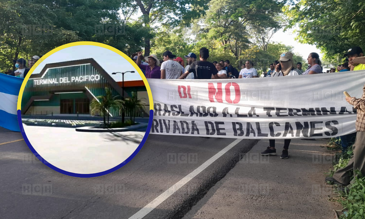 Los manifestantes protestan este día en la salida a Guasaule con banderas y pancartas exigiendo una vez más no ser trasladados a la nueva Terminal, misma que entró el pasado 1 de agosto en vigencia.