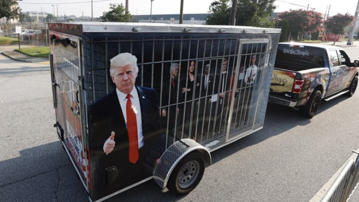 Rick Hern, de 44 años y residente de Atlanta, llegó a primera hora a la prisión ataviado con un gorro de pescador para el sol y un cartel que equipara a Trump con el exmandatario sudafricano y premio Nobel de la Paz Nelson Mandela junto al lema “presos políticos”.