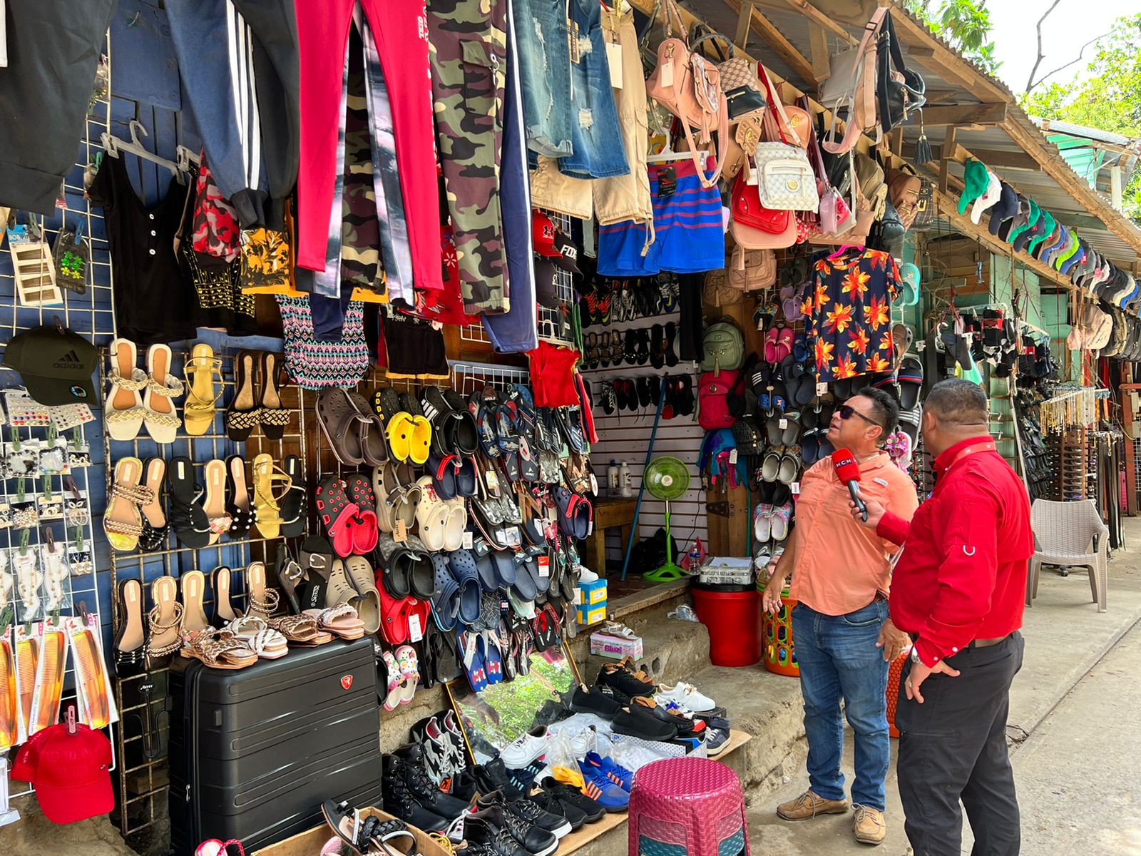El periodista Alex Cáceres junto al corresponsal Rigoberto Torres recorren los pasillos del mercado municipal de Roatán para conocer lo que los locatarios ofrecen a los pobladores.