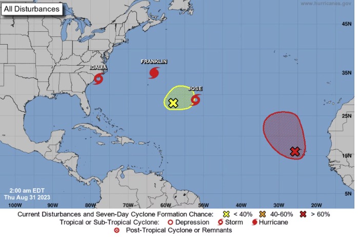 “José se está moviendo hacia el norte a cerca de cinco millas por hora y se espera que este movimiento general, con un aumento en la velocidad de avance, continúe durante aproximadamente el día siguiente antes de que Franklin absorba el sistema”, explicó el Centro Nacional de Huracanes.