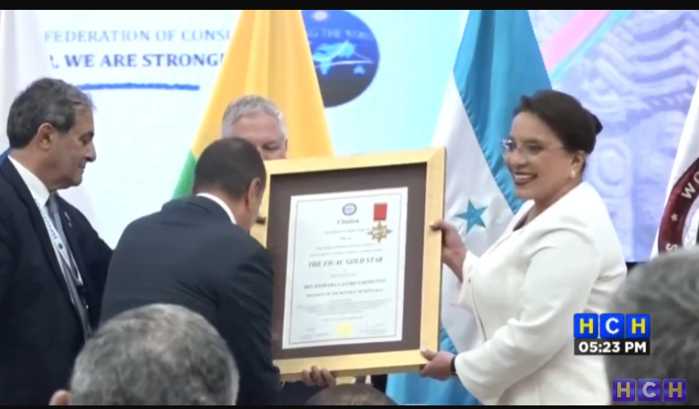 La presidenta Xiomara Castro, recibe condecoración Estrella de Oro por parte de la Federación Mundial de Cónsules, representada por el honorable señor Nikolaos Margaropoulos, presidente de la FICAC.