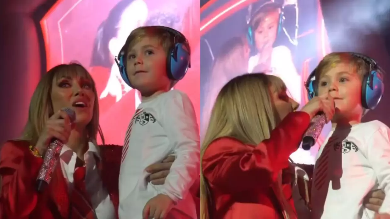 Aunque Anahí intentó que su primogénito cantara frente a sus seguidores, Manuel, de 6 años, quedó impactado por los gritos y aplausos del público, limitándose a mirar asombrado el recinto.
