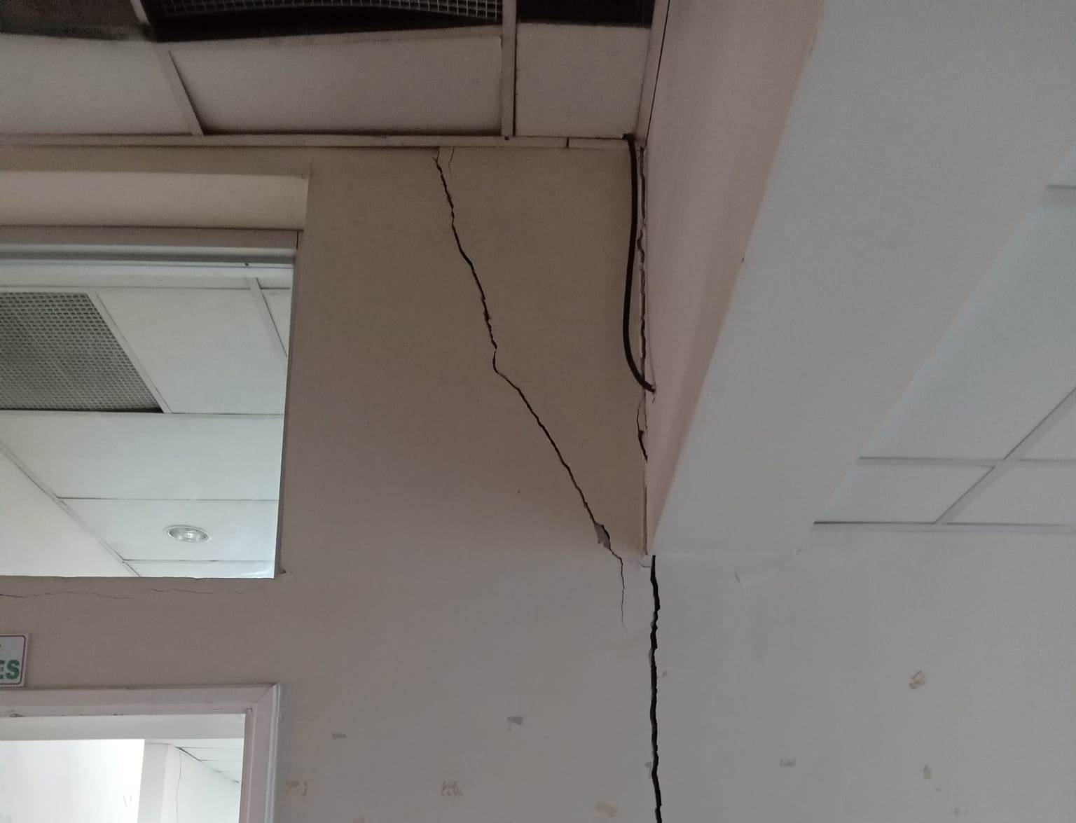 Las paredes y techos de este edificio tienen grietas y llevan unos tres meses sin contar con el servicio de agua potable, empleados de este centro médico denuncian que las autoridades están al tanto de las malas condiciones del edificio y no hacen nada por reparar las instalaciones.