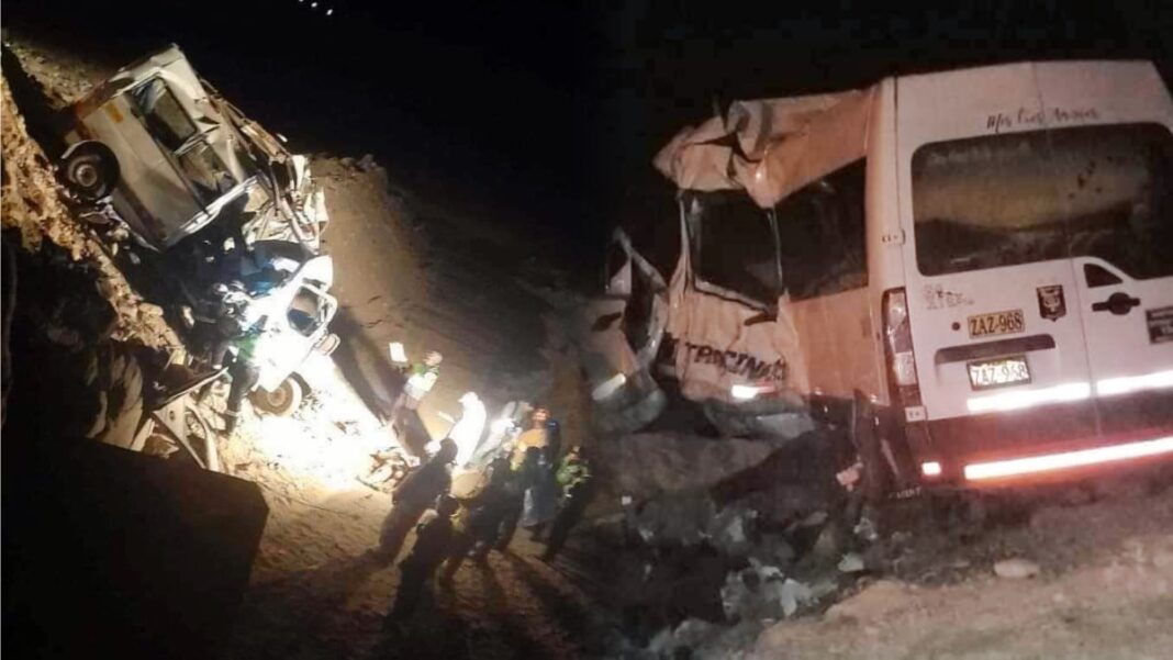 La policía de carreteras indicó a la prensa que la colisión, ocurrida la víspera, provocó la volcadura del transporte de la empresa Caminos del Inca en la vía Panamericana, a la altura del distrito de Vitor, a dos horas de la capital regional de Arequipa. Nueve personas sufrieron contusiones y cortaduras.
