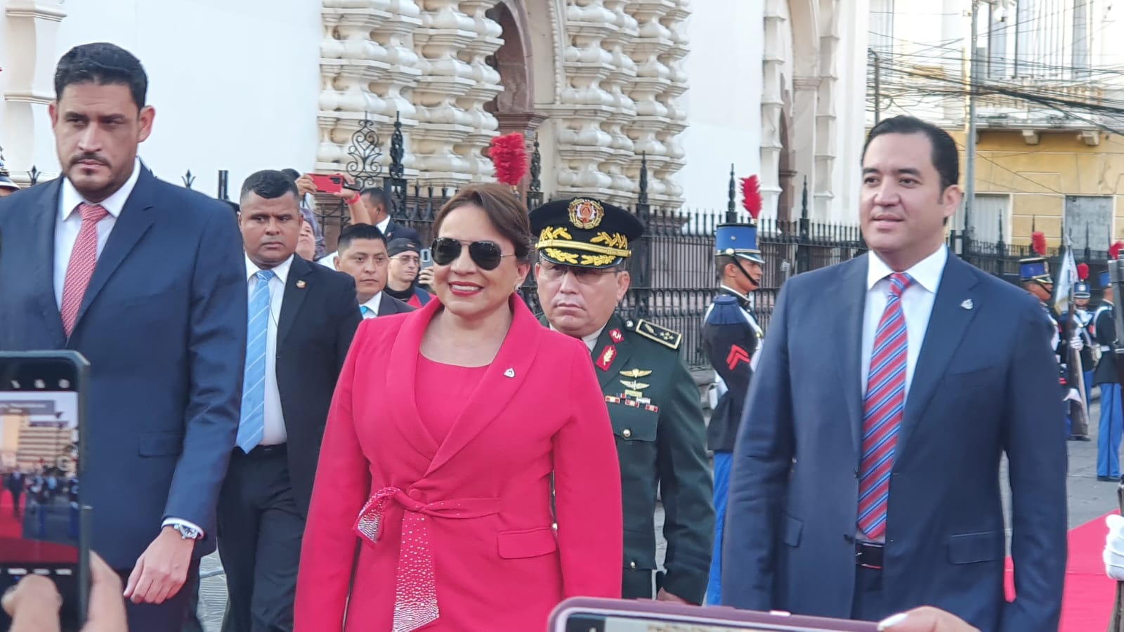 Xiomara Castro llegó acompañada del Secretario Privado Manuel Zelaya y del Titular de Defensa José Manuel Zelaya para incorporarse al evento donde ya la esperaban el Presidente del Congreso Nacional y la presidenta de la Corte Suprema de Justicia.