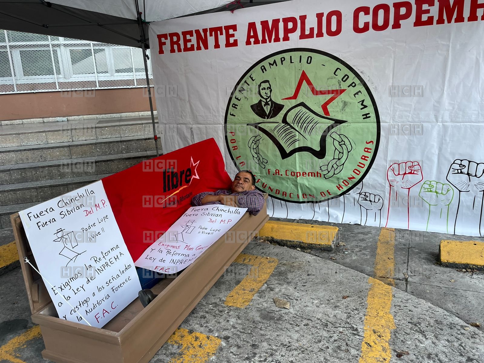 Acostado en un ataúd docente protesta frente a las instalaciones del Ministerio Público.