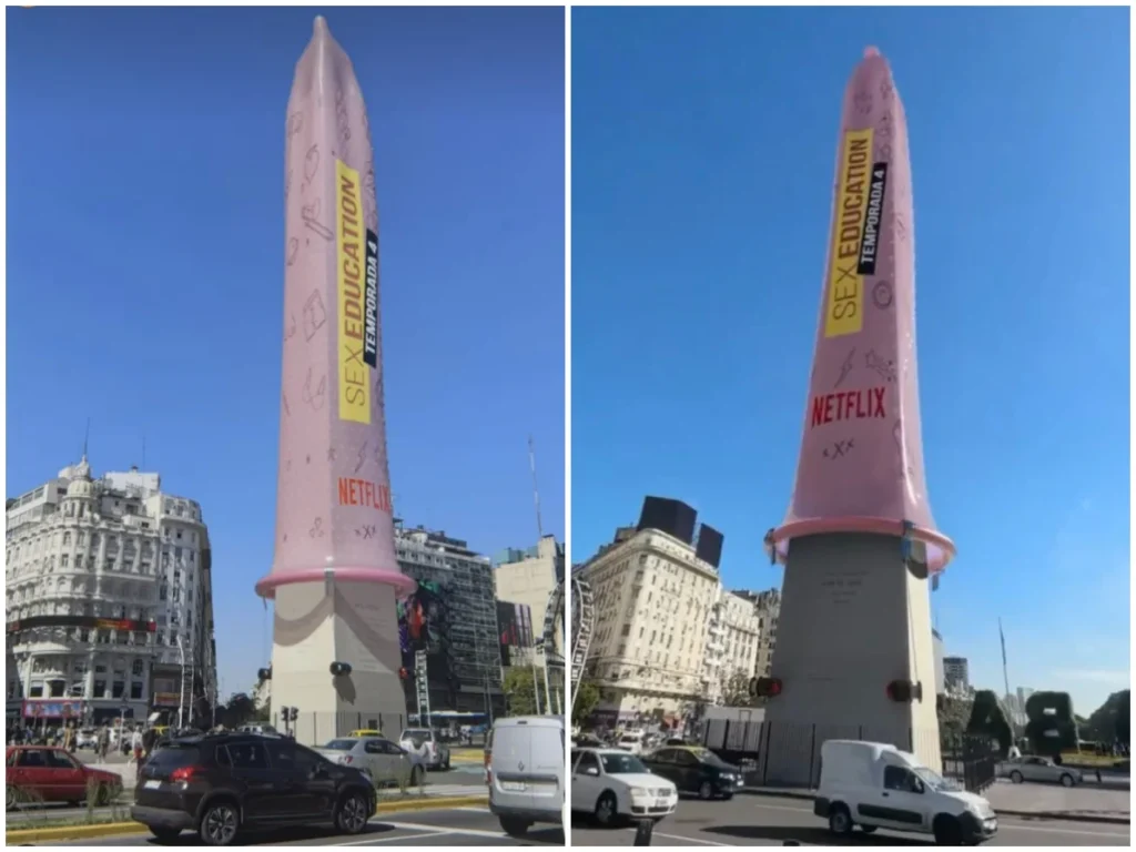 El obelisco de Buenos Aires (Argentina) lució cubierto por un preservativo gigante color rosa para promocionar el estreno de la cuarta temporada de la popular serie “Sex Education», de la plataforma de streaming Netflix.