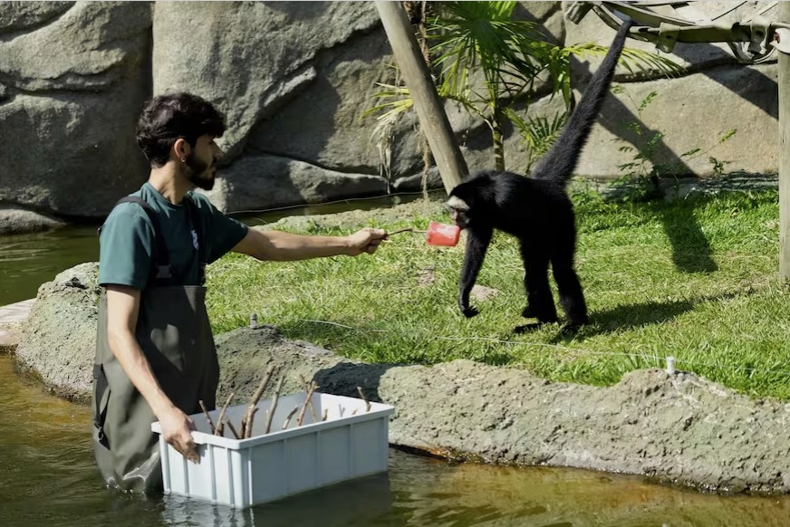 Al ver a un cuidador del zoo con un cubo lleno de paletas heladas con sabor a fruta, los monos araña negros del BioParque de Río de Janeiro se dirigieron elegantemente hacia él, chillando con entusiasmo.