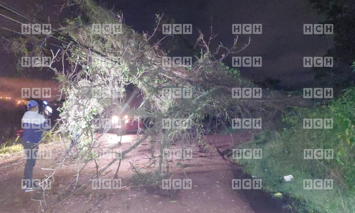 Un enorme árbol cayó sobre una calle principal de la colonia Sagastume de Tegucigalpa, y a su paso se llevó un poste del tendido eléctrico.