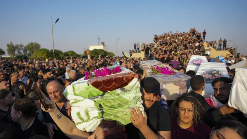 Los dolientes se reunieron en el cementerio de la ciudad septentrional de Hamdaniya en torno a los clérigos de varias iglesias que oficiaron la ceremonia. Algunos fieles sostenían los retratos de sus seres queridos fallecidos.
