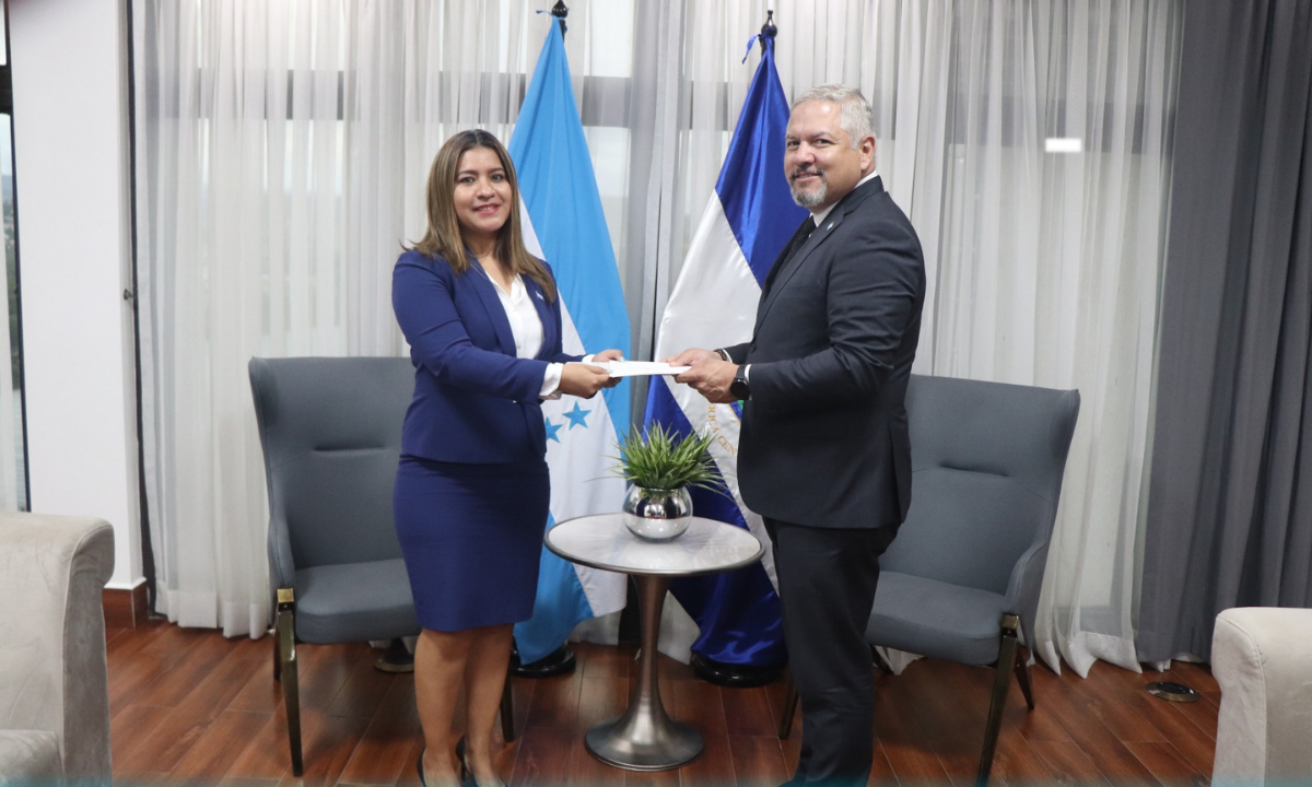 El secretario de Relaciones Exteriores y Cooperación Internacional, Enrique Reina, este día recibió las Copias de Estilo de la Excelentísima Señora Iris Audelly Acuña Huete, que la acreditan como Embajadora Extraordinaria y Plenipotenciaria de la República de Nicaragua.