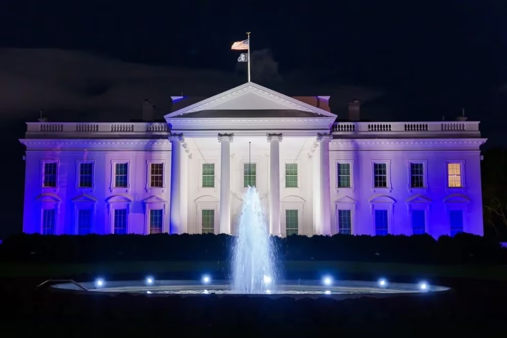 La fachada de la residencia presidencial estadounidense, en Washington, quedó iluminada de azul y blanco para conmemorar también los 75 años de relación bilateral entre Estados Unidos e Israel.