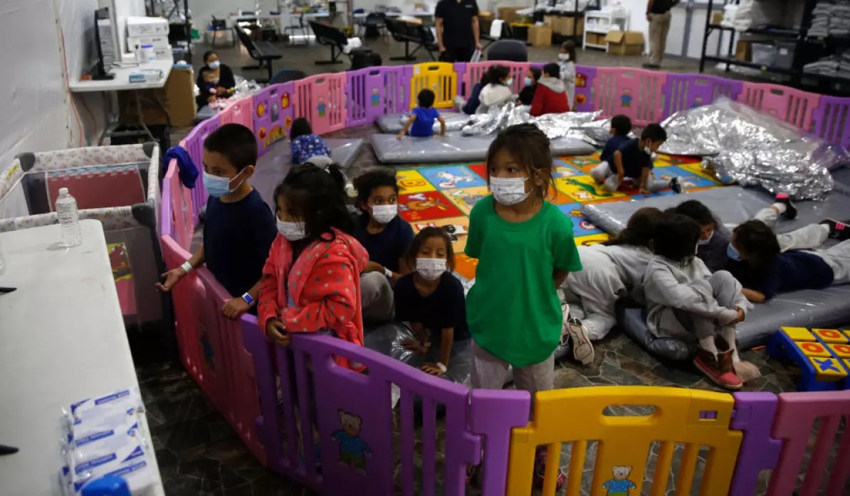 Niños migrantes no acompañados, de entre 3 y 9 años, ven televisión dentro de un parque infantil en el centro de detención del Departamento de Seguridad Nacional de Donna, el principal centro de detención para niños no acompañados en el Valle del Río Grande en Donna, Texas, 30 de marzo de 2021. Crédito: DARIO LOPEZ-MILLS/POOL/AFP via Getty Images