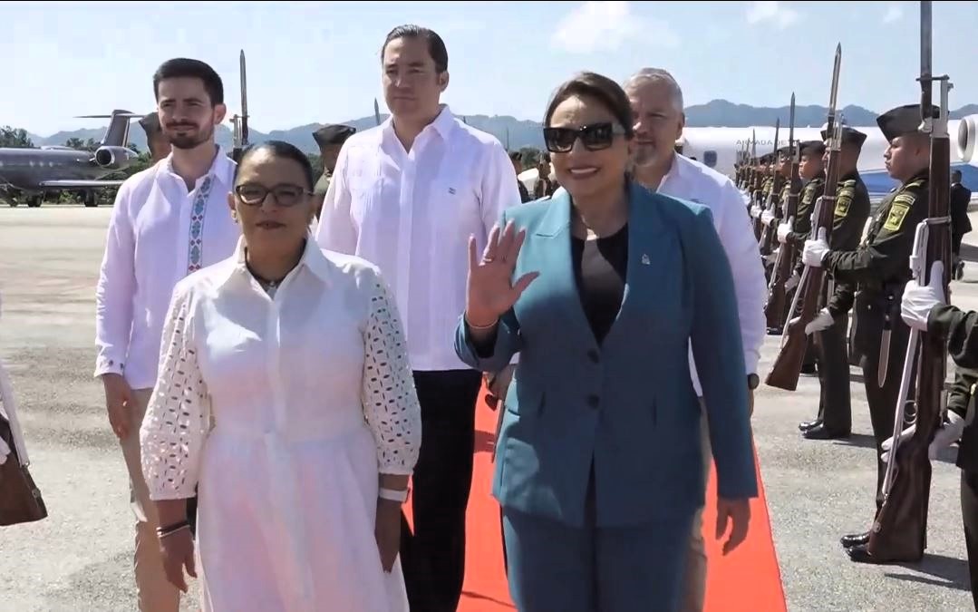 La jefa de Estado arribó al aeropuerto internacional de Palenque, Chiapas, al filo de las 10:25, hora local, acompañada del canciller hondureño, Eduardo Enrique Reina, y el secretario privado, Héctor Manuel Zelaya.