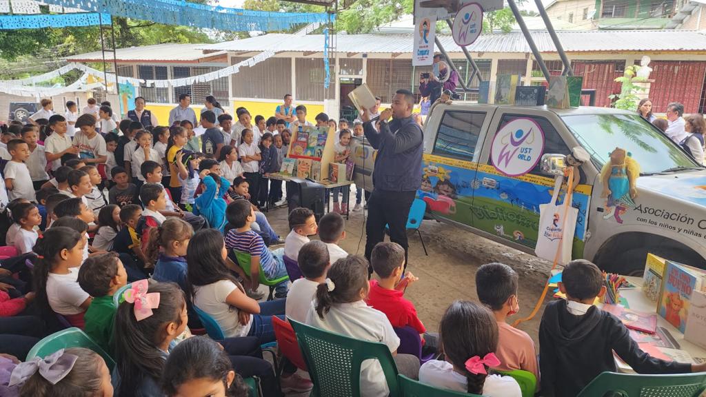 La “Bibliomóvil” se inauguró en la escuela Francisco Morazán de El Jicarito, San Antonio de Oriente; con la presencia de la directora de la Asociación Compartir, Rosa María Nieto; el representante de JustWorld, Daniel O’Connor; la embajadora de JustWorld, Dora Bográn; el director municipal de Educación, Héctor Miguel Mejía, entre otras autoridades escolares de la zona.