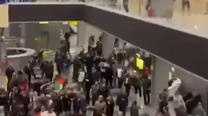 Un video en las redes sociales mostró a algunos entre la multitud en el campo de aterrizaje ondeando banderas palestinas.