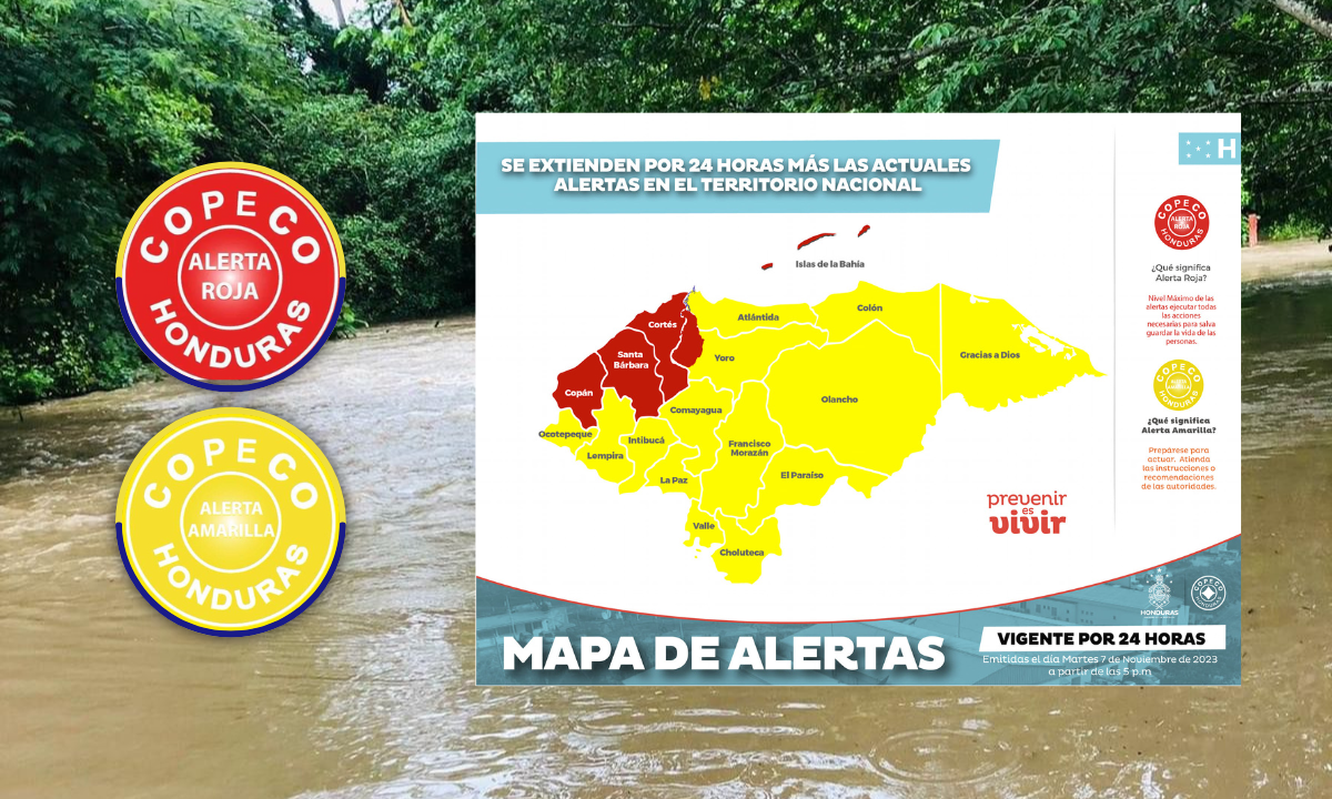 Por las lluvias constantes en el territorio nacional, saturación de suelos, deslizamientos en carreteras y daños, la Secretaría de Estado en los Despachos de Gestión de Riesgos y Contingencias Nacionales, extiende la alerta roja a los departamentos de Islas de la Bahía, Cortés, Santa Bárbara y Copán, por un período de 24 horas a partir de las 5 p.m. de hoy martes 7 de noviembre de 2023.