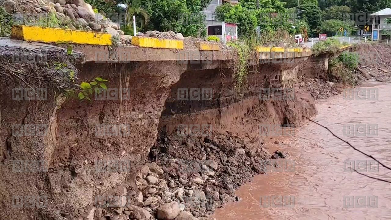 El caudal del río Copán destruye el paso vehicular a la altura de la CA-11 en el barrio el Estribo, municipio de Santa Rita en el departamento de Copán.