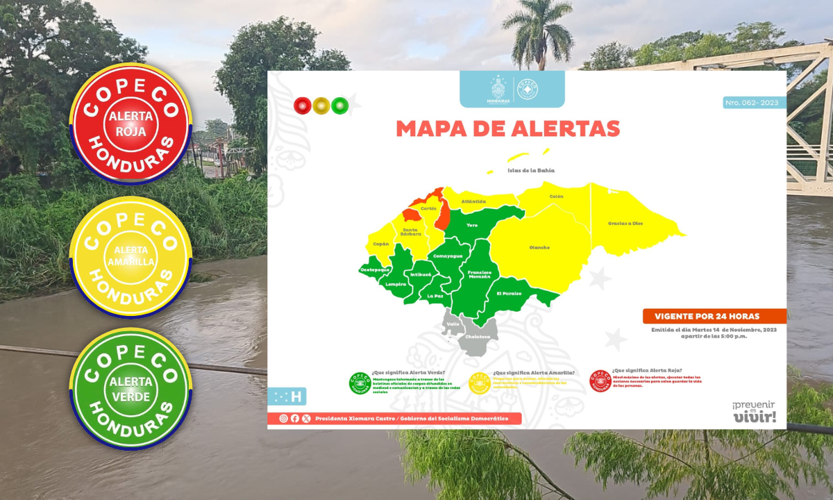 Por Fuertes lluvias, deslizamientos, crecidas de los ríos, inundaciones y sectores incomunicados, la Secretaría de Estado en los Despachos de Gestión de Riesgos y Contingencias Nacionales, eleva a alerta roja al municipio de Quimistán del departamento de Santa Bárbara y a los municipios de Omoa y Puerto Cortés del departamento de Cortés.